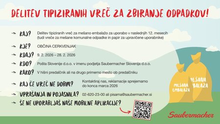 DELITEV TIPIZIRANIH VREČ ZA ZBIRANJE ODPADKOV - obvestilo Saubermacher Slovenija d.o.o.14.01.2026Delitev tipiziranih vreč za z biranje odpadkov bo v času od 9. 2. 2026 – 28. 2. 2026, s strani Pošte Slovenija d.d.