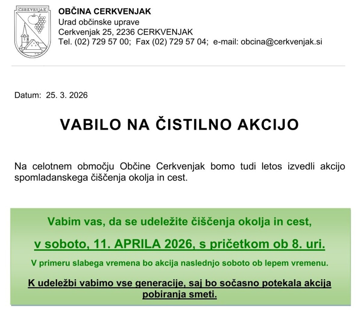 Vabim vas, da se udeležite čiščenja okolja in cest, v soboto, 11. APRILA 2026, s pričetkom ob 8. uri. V primeru slabega vremena bo akcija naslednjo soboto ob lepem vremenu. K udeležbi vabimo vse generacije, saj bo sočasno potekala akcija pobiranja smeti.