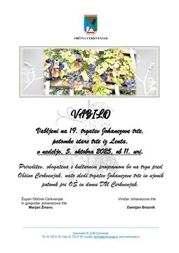 05okt.19. TRGATEV JOHANEZOVE TRTECerkvenjak 25, CerkvenjakVabljeni na 19. trgatev Johanezove trte, potomke stare trte iz Lenta, v nedeljo, 5. oktobra 2025, ob 11. uri. Prireditev, obogatena s kulturnim programom bo na trgu pred Občino Cerkvenjak, nato sledi trgatev Johanezove trte in njenih potomk pri OŠ in domu DU Cerkvenjak.