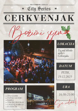 BOŽIČNI SEJEM09.12.2025BOŽIČKOVANJE IN BOŽIČNI SEJEM V CERKVENJAKU Tradicionalni Božični sejem na trgu v Občini Cerkvenjak se vrača tudi letos! Dogodek, ki že vrsto let povezuje lokalno skupnost, bo znova napolnil trg z zimskimi vonjavami, otroškim nasmehom in prazničnim razpoloženjem. Na sejmu se bodo prepletali vonji dišečega čaja, domačega kuhanega vina in slastnih palačink. Obiskovalce bodo razveseljevali ustvarjalni kotički za najmlajše, praznične melodije ter bogata ponudba lokalnih in drugih razstavljavcev, ki bodo s svojimi izdelki poskrbeli, da boste praznična darila našli kar na enem mestu. Poseben čar dogodku bo ponovno dodal veličastni prihod Božička na kočiji, s katero se bodo lahko zapeljali tudi obiskovalci. Kdo ve – morda nas letos preseneti celo sneg. Petek, 19. december 2025, ob 16.30. Program se bo začel z ogledom odlične gledališke predstave ( -