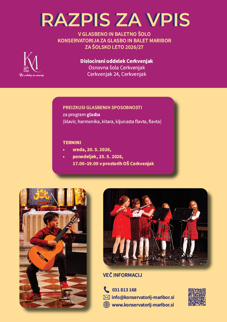 Konservatorij za glasbo in balet Maribor, dislocirani oddelek Cerkvenjak, objavlja razpis za vpis v glasbeno šolo za šolsko leto 2026/27.